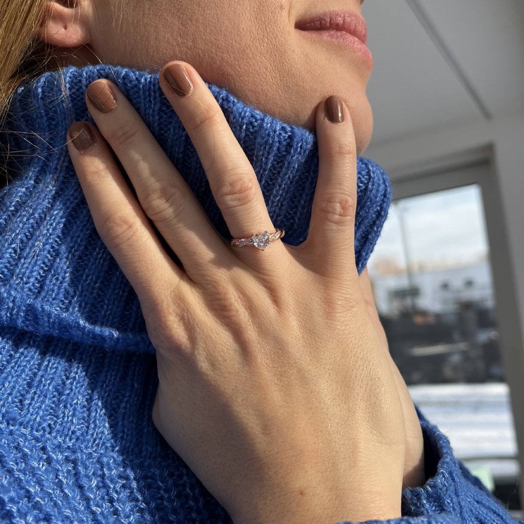 Povrch prstenu je zpracován technikou zlacení ROSE, což dodává prstenu jeho charakteristickou růžovou barvu. Tato barva v kombinaci se stříbrem 925/1000 vytváří perfektní harmonii a působí velmi romanticky.