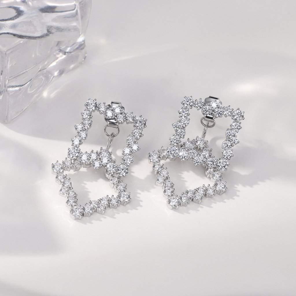 Náušnice mají visací provedení s pohodlným zapínáním na puzetu, což zaručuje bezpečné a příjemné nošení. Centrálním prvkem je třpytivý čtvercový motiv o velikosti 14 × 14 mm, doplněný dokonale broušenými zirkony, které krásně odrážejí světlo při každém pohybu.