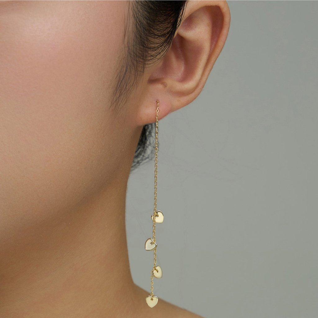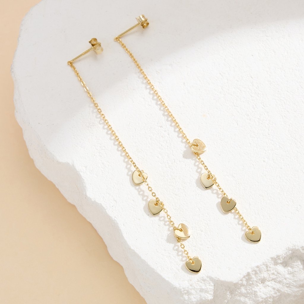 Stříbrné náušnice LIVIANE pozlacené jsou nádherným šperkem z ryzího stříbra 925/1000 s luxusní povrchovou úpravou 14K zlacením. Tyto elegantní visací náušnice mají řetízkový design zakončený přívěsky ve tvaru srdíček, které symbolizují lásku, něhu a romantiku.