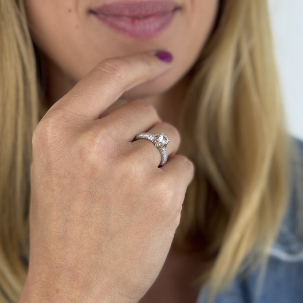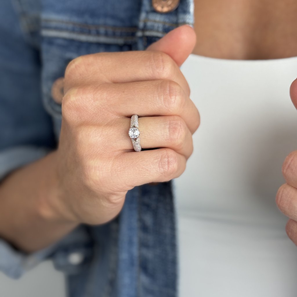 Tento nádherný prsten je zdobený okouzlujícím zářivým kamínkem, který je obklopený malými zirkony. Tyto zirkony jsou pečlivě usazeny kolem středového kamínku, který je středobodem tohoto kouzelného prstenu. Jejich třpyt dodává prstenu další rozměr krásy.