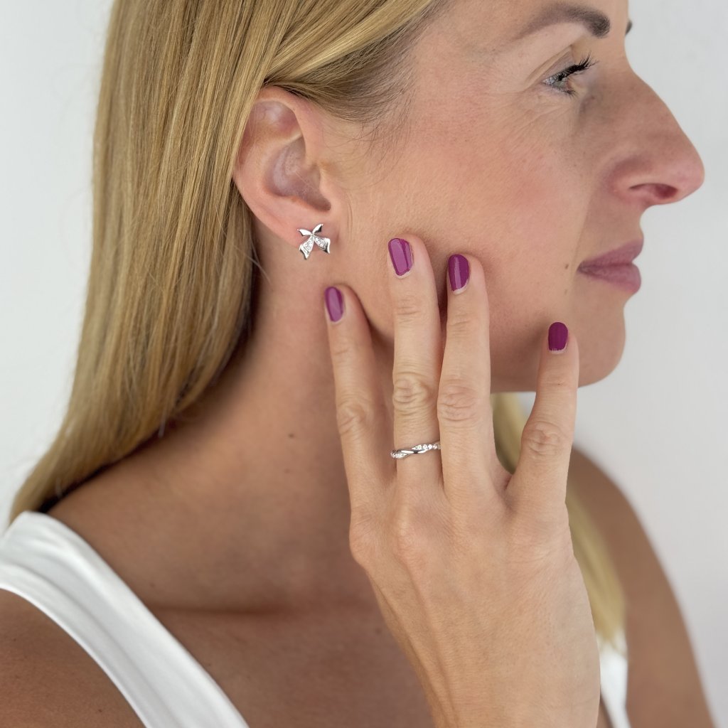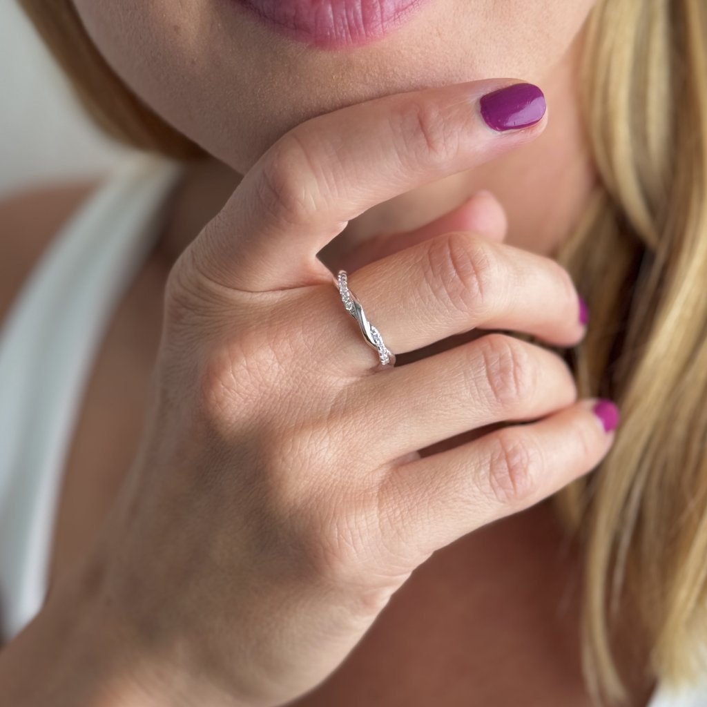 Představujeme vám stříbrný prsten KARMEN, který vyniká svým unikátním designem dvou propletených linií. Tento půvabný šperk je vyroben z kvalitního stříbra ryzosti 925/1000 a kombinuje čistou linii s druhou částí, která je osázena třpytivými zirkony o průměru 1,5 mm.