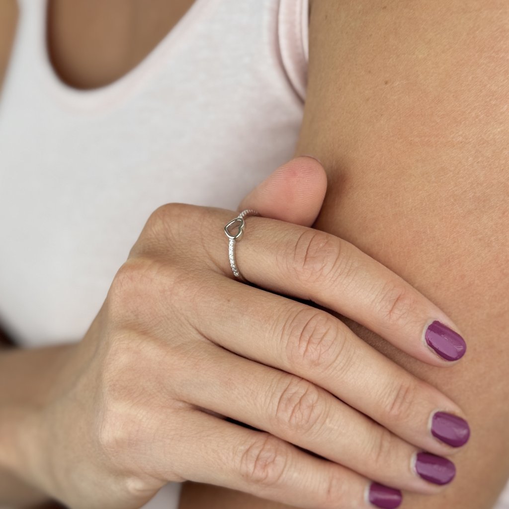 Vyroben z kvalitního stříbra s ryzostí 925/1000 a opatřen rhodiovou úpravou, která zajišťuje dlouhotrvající lesk a odolnost proti zašednutí. Jemná šířka obroučky pouhý 1 mm zaručuje pohodlné nošení a vytváří dokonalou harmonii s dominantním srdíčkem.