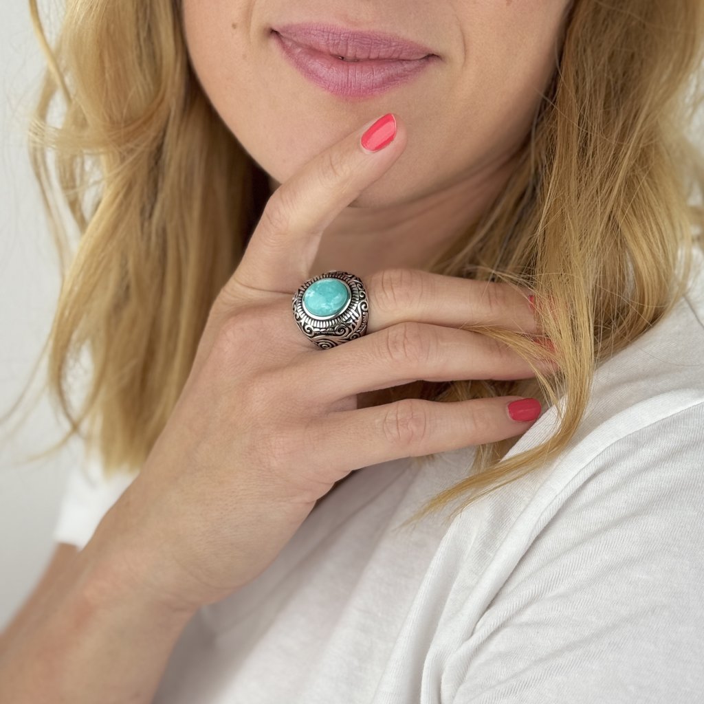 Stříbrný prsten CASEY představuje mistrovské propojení tradičního řemesla s odvážným moderním designem. Dominantu prstenu tvoří výrazný syntetický tyrkys o rozměrech 10 × 12 mm, který je efektně doplněn precizně vyřezávanými černými geometrickými motivy, vytvářejícími fascinující kontrast s lesklým stříbrem.