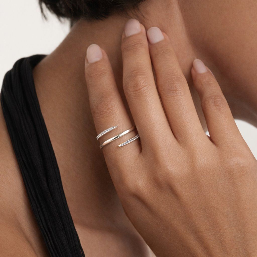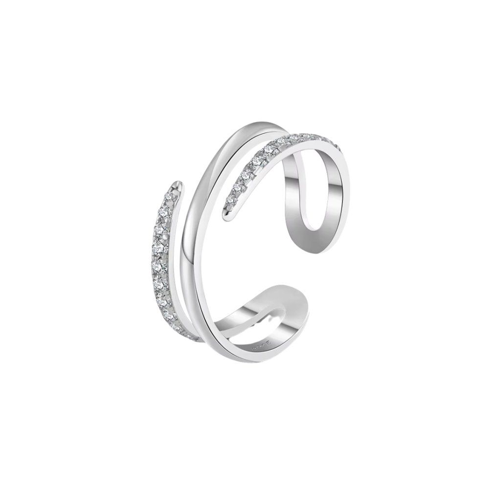 Stříbrný nastavitelný prsten KAVALA je elegantní šperk, který okouzlí svým propracovaným designem na první pohled. Širší korunka o šířce 8 mm je jemně osázena drobnými čirými zirkony o rozměru 1 mm, které společně vytvářejí sofistikovanou třpytivou plochu připomínající jemnou krajku ze světla. Navzdory své šířce si prsten zachovává vzdušnost a ženskou grácii, díky čemuž elegantně doplní každý outfit.