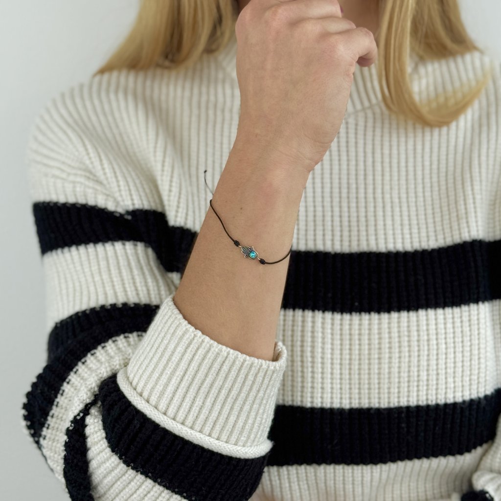 Náramek je vyroben z kvalitního nylonového provázku, který je příjemný na kůži a zároveň odolný. Přívěsek ve tvaru hamsy je vyroben ze stříbra 925 a jeho povrch je oxidován, což mu dodává osobitý a sofistikovaný vzhled.