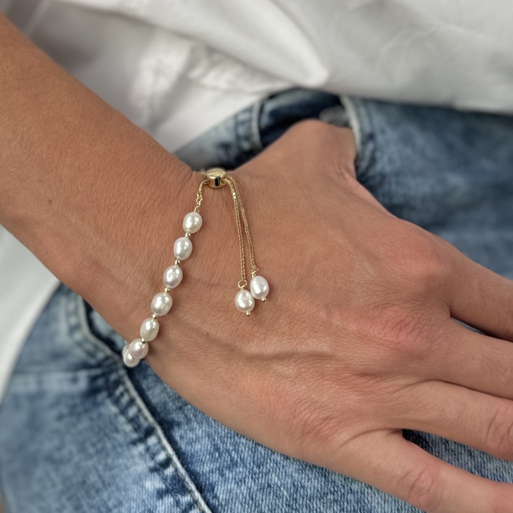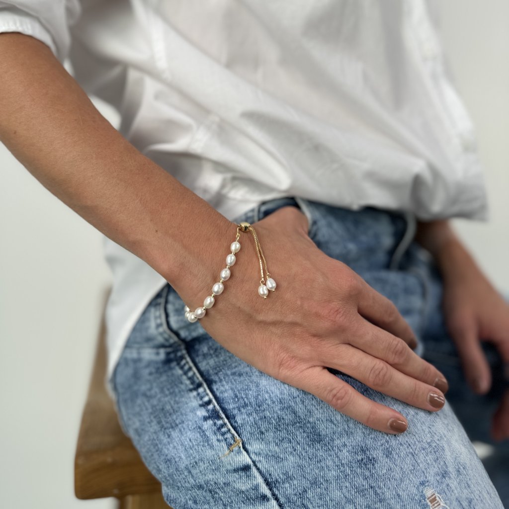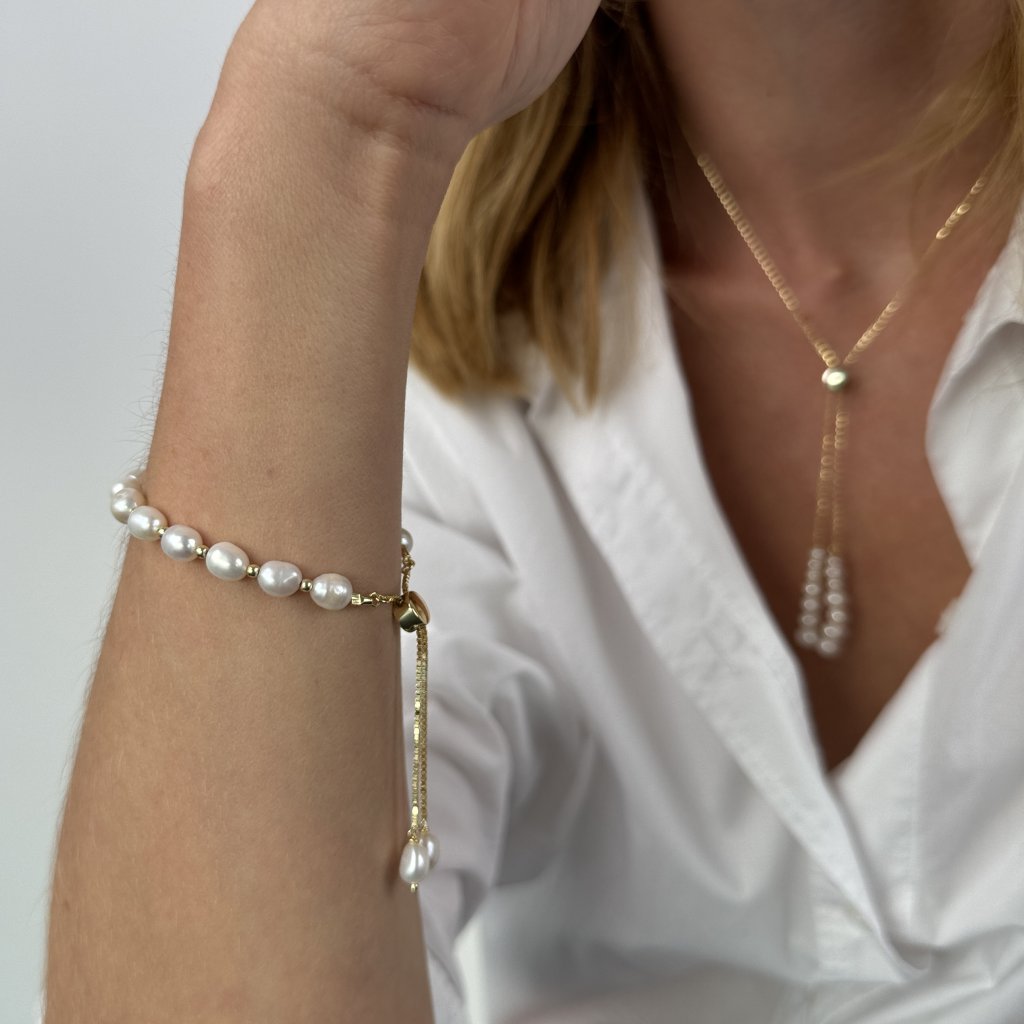 Náramek má jedinečný design, kde se střídají krásné perly o šířce 7 mm s jemným pozlaceným řetízkem o šířce 1 mm. Tato kombinace vytváří zajímavý kontrast a dodává náramku sofistikovaný charakter.