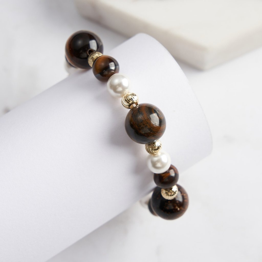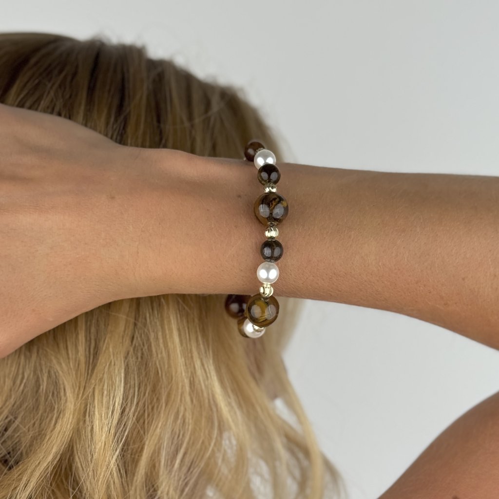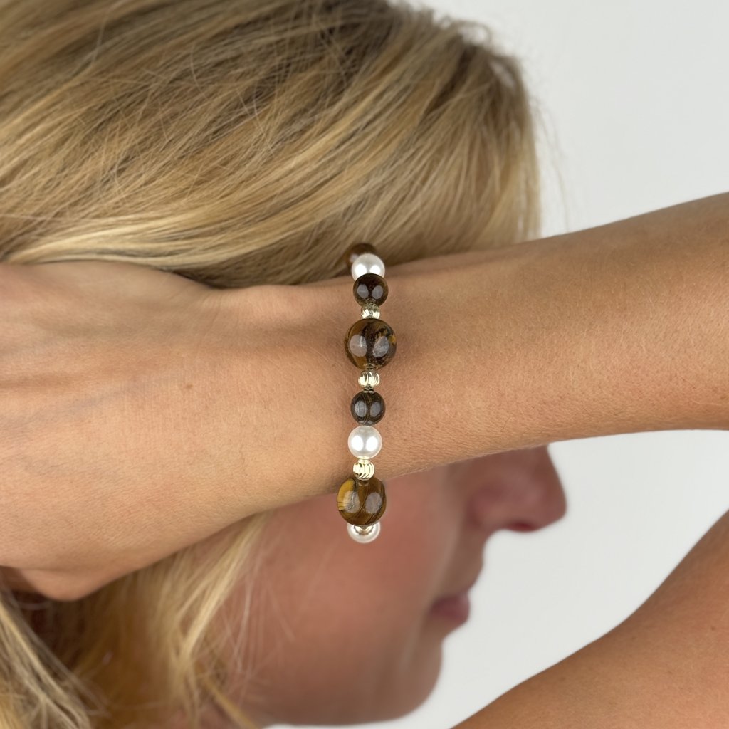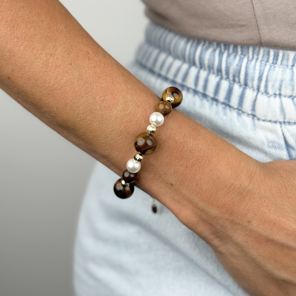 Pozlacený stříbrný náramek s přívěsky TYLER je šperkem, který spojuje eleganci, styl a duchovní význam. Tento jemný náramek je zdoben sladkovodními perlami a polodrahokamy tygřího oka, které je známé pro své ochranné a antistresové vlastnosti. Kombinace zlaté barvy, perel a hnědých odstínů tygřího oka vytváří harmonický design, který dokonale doplní každý outfit.