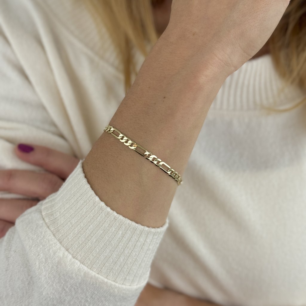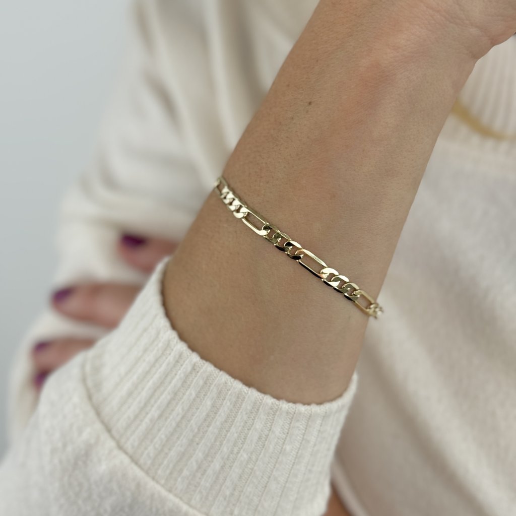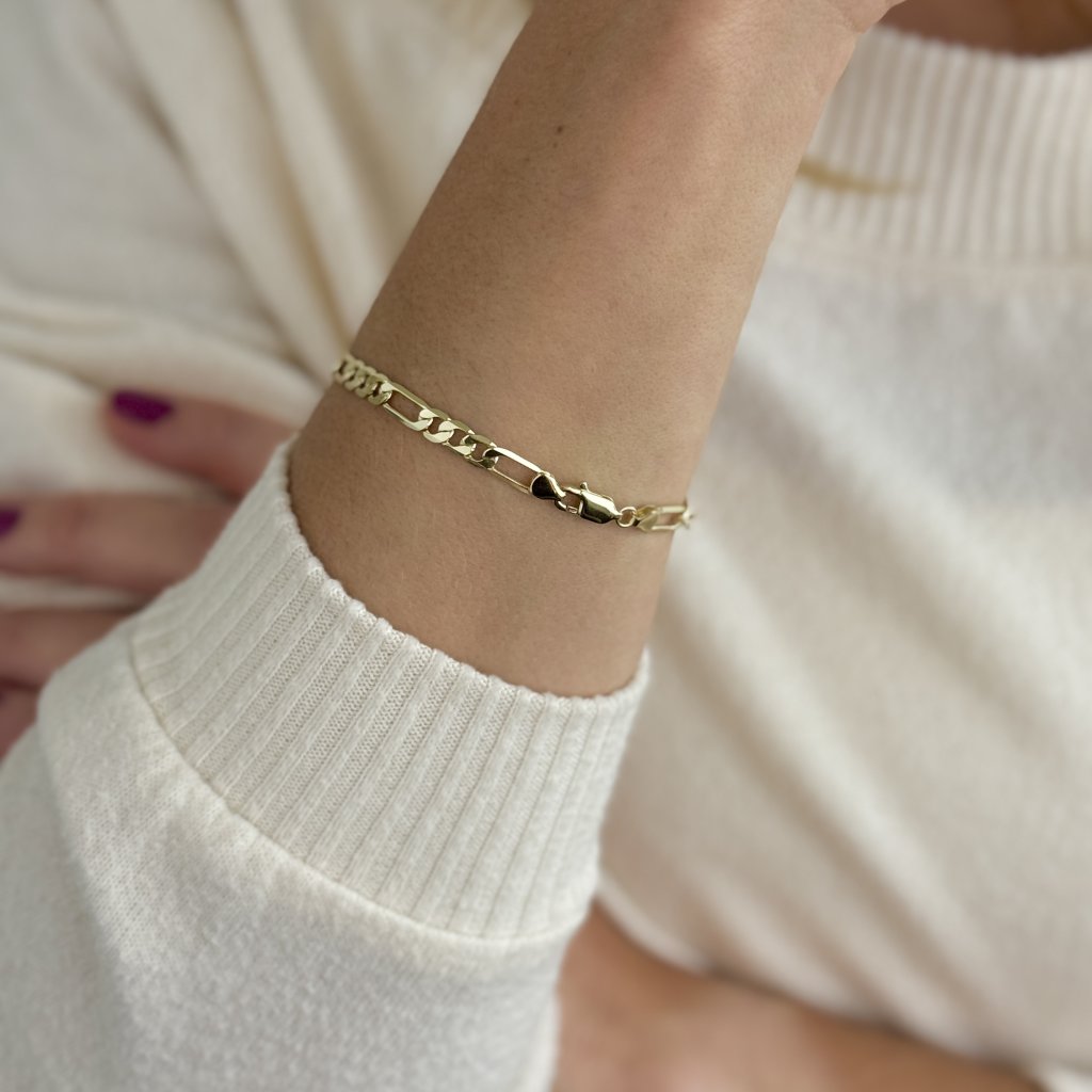 Stříbrný náramek NOEL, pozlacený 14karátovým zlatem, přináší harmonii elegance a všestrannosti v jednom. S délkou 16 cm a šířkou 5 mm je ideální pro muže i ženy, kteří hledají stylový doplněk pro každou příležitost. Vyroben z kvalitního stříbra 925, tento náramek se pyšní luxusním vzhledem klasického Figaro řetízku, který přitahuje pozornost svým jemným zlatým leskem.