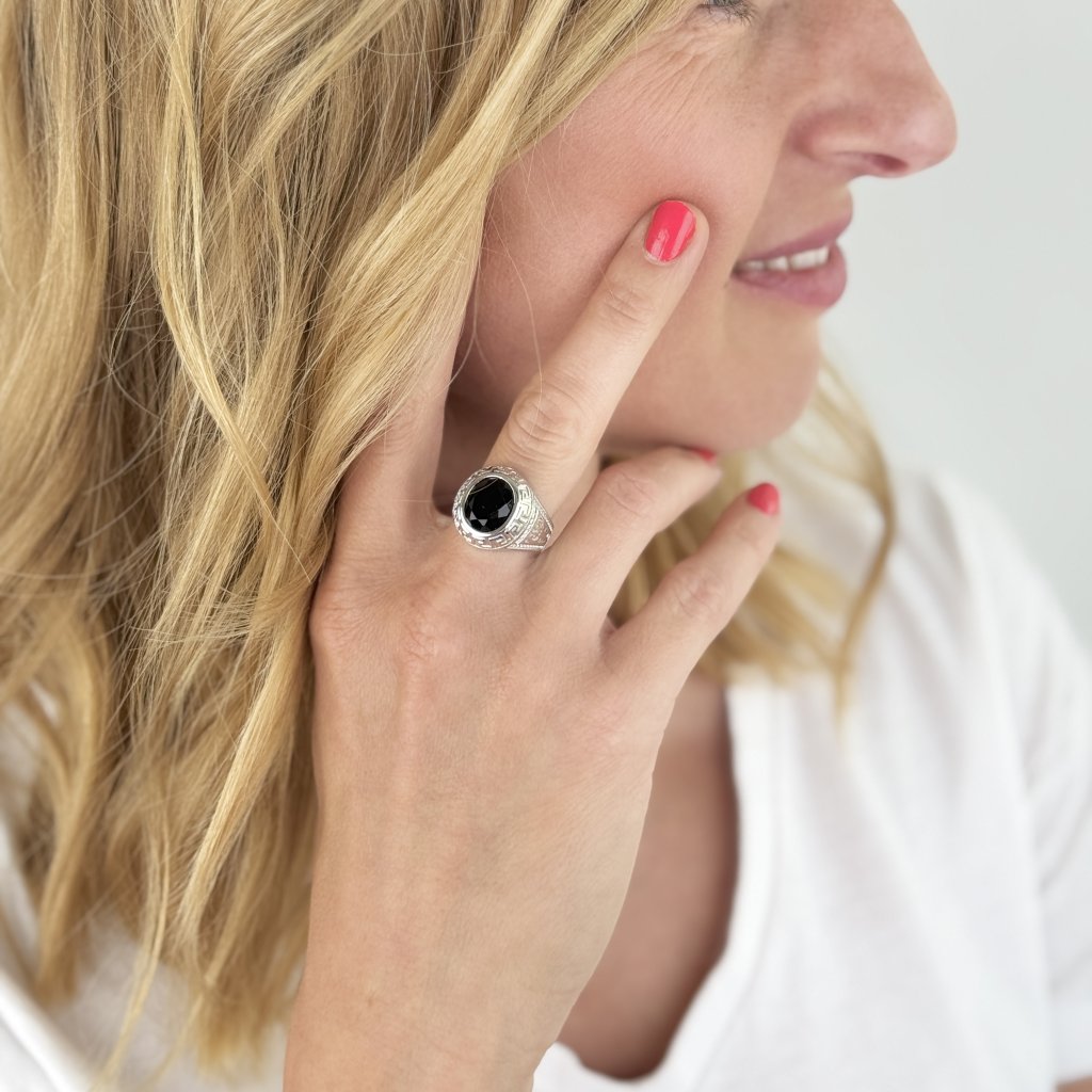 Stříbrný prsten JULIAN představuje mistrovské spojení tradičního řemesla a současného designu. Dominantu prstenu tvoří ušlechtilý černý onyx o rozměrech 9 × 12 mm, který je doplněn precizně vyřezávanými geometrickými tvary po obvodu prstenu.