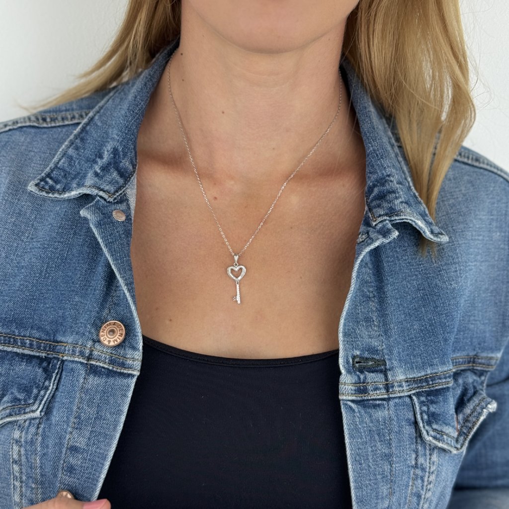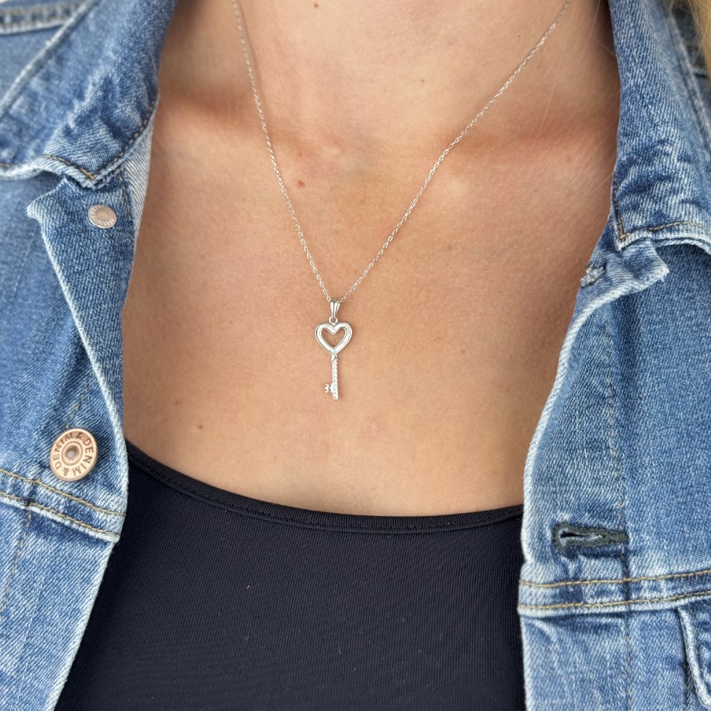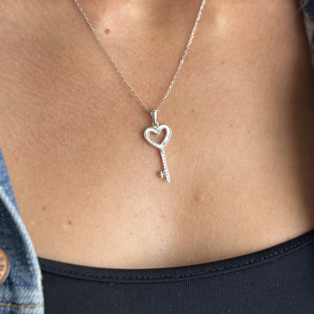 Představujeme Vám náš stříbrný řetízek s přívěskem s klíčem k srdci, který je vyrobený z kvalitního stříbra 925 a je osázený zářivými zirkony. Tento jedinečný šperk je inspirován touhou po lásce a touze poznat tajemství srdce.