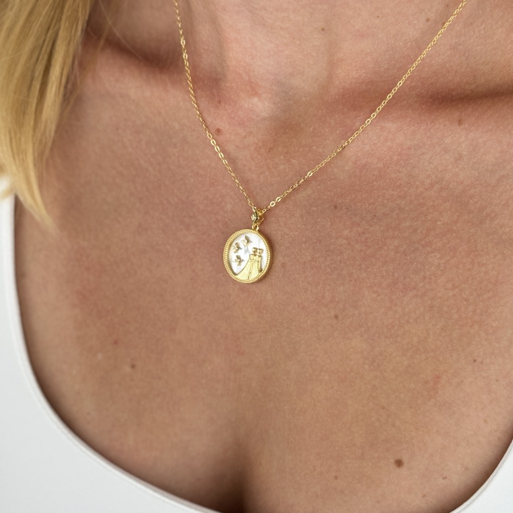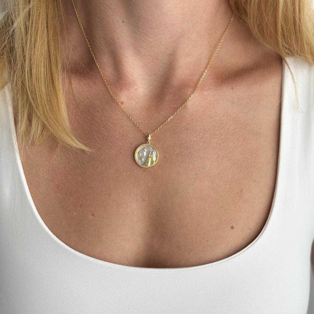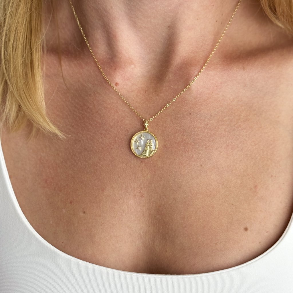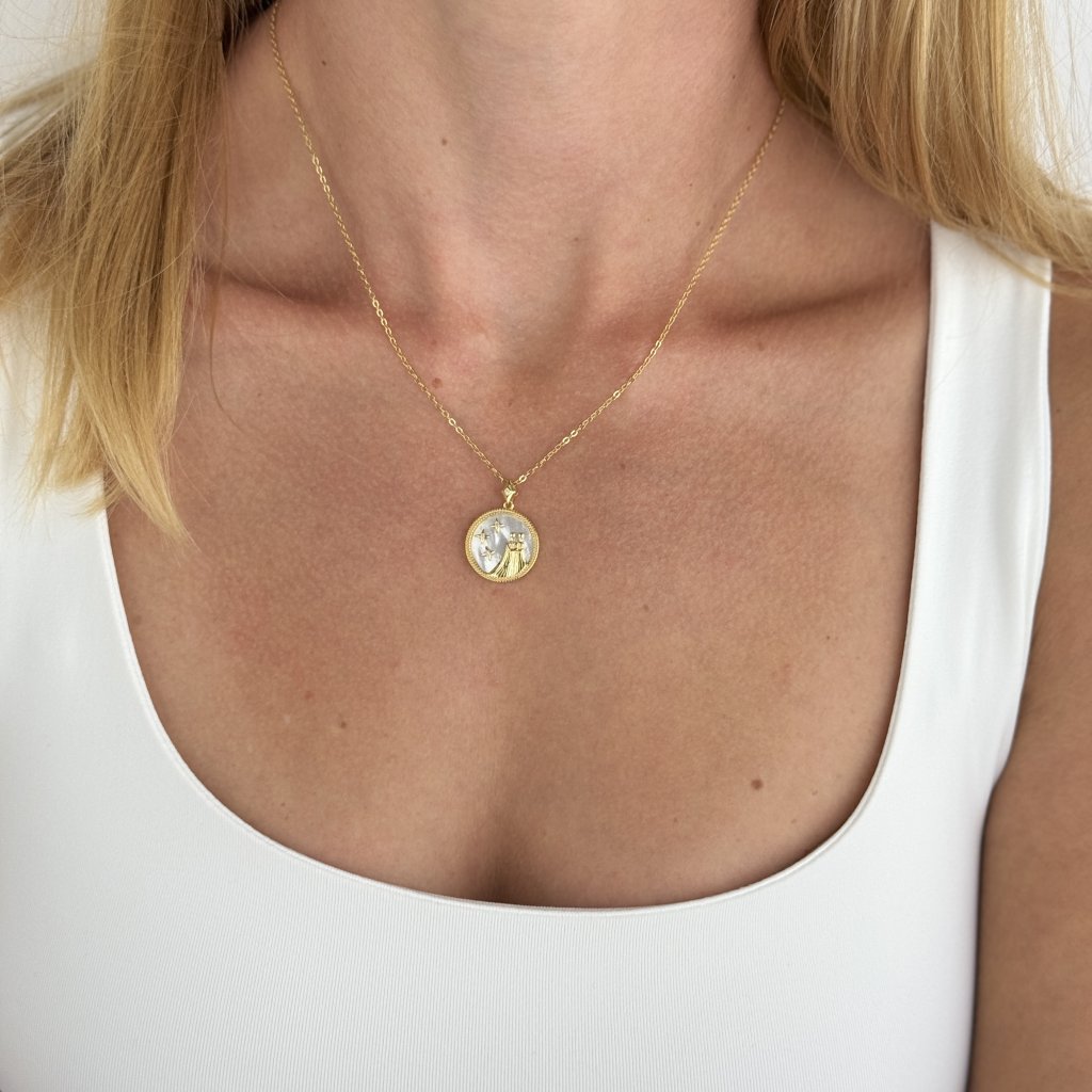 Stříbrný přívěsek s řetízkem MOONLIGHT GEMINI je skvělým dárkem pro všechny narozené ve znamení Blíženců. Tento šperk v sobě spojuje hravost a krásu tohoto vzdušného znamení. Pozlacený kulatý přívěsek o průměru 18 mm je ozdoben vyobrazením Blíženců na bílém pozadí, které evokuje záři měsíční oblohy.