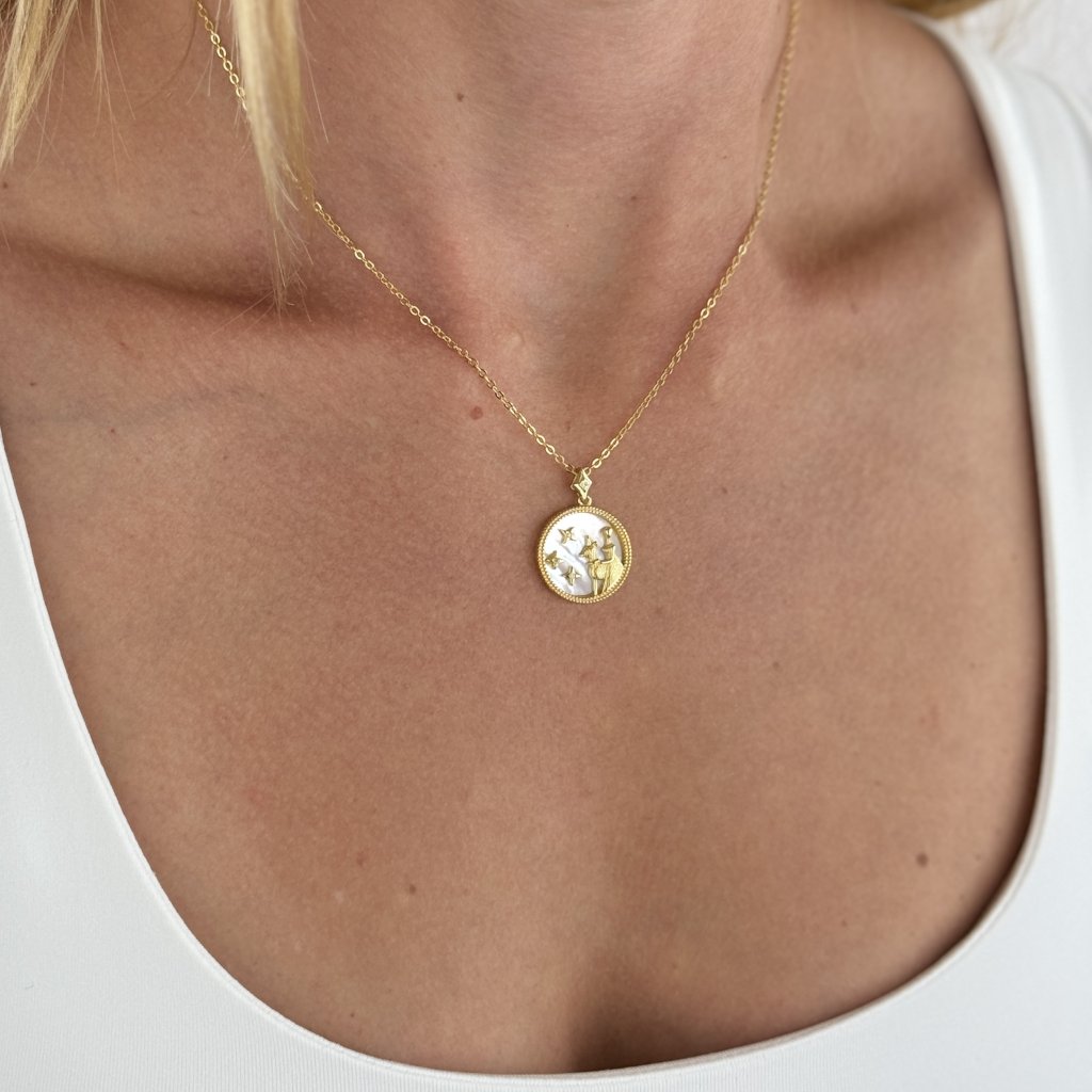Stříbrný přívěsek s řetízkem MOONLIGHT VIRGO je perfektním dárkem pro všechny narozené ve znamení Panny. Tento šperk v sobě spojuje eleganci a krásu tohoto zemského znamení. Pozlacený kulatý přívěsek o průměru 18 mm je ozdoben vyobrazením Panny na bílém pozadí, které evokuje záři měsíční oblohy.