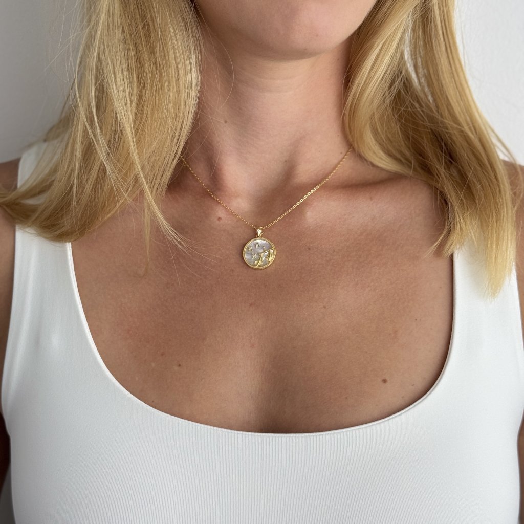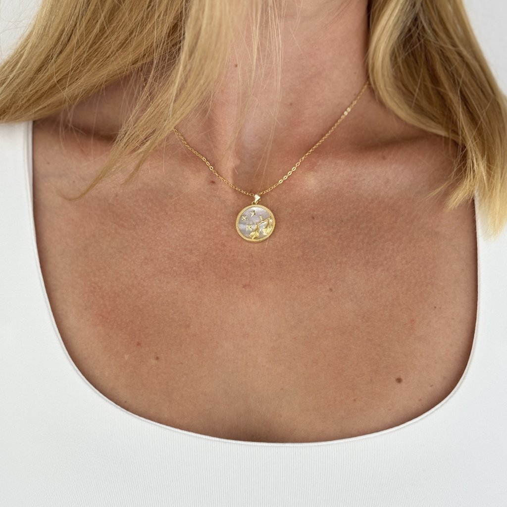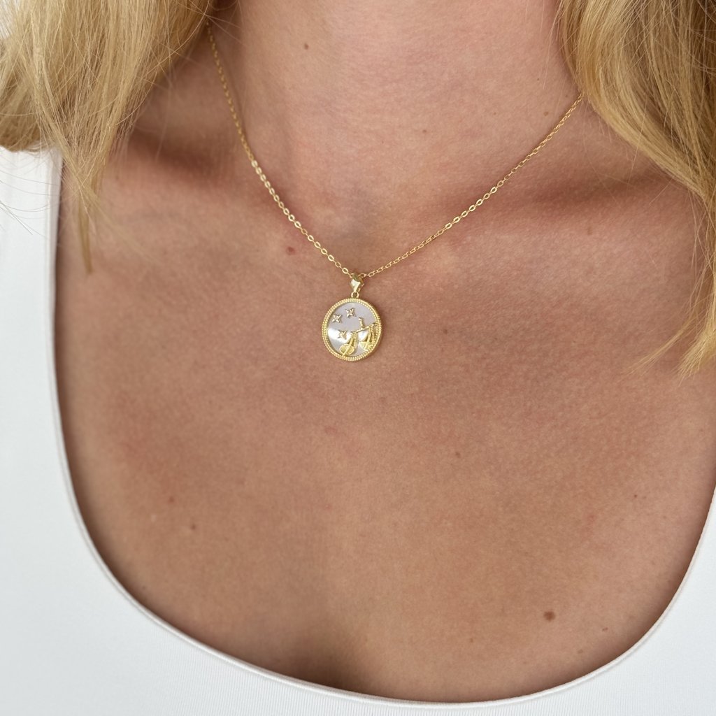 Stříbrný přívěsek s řetízkem MOONLIGHT LIBRA je skvělým dárkem pro všechny narozené ve znamení Vah. Tento šperk v sobě spojuje krásu a rovnováhu tohoto vzdušného znamení. Pozlacený kulatý přívěsek o průměru 18 mm je ozdoben vyobrazením Vah na bílém pozadí, které evokuje záři měsíční oblohy.