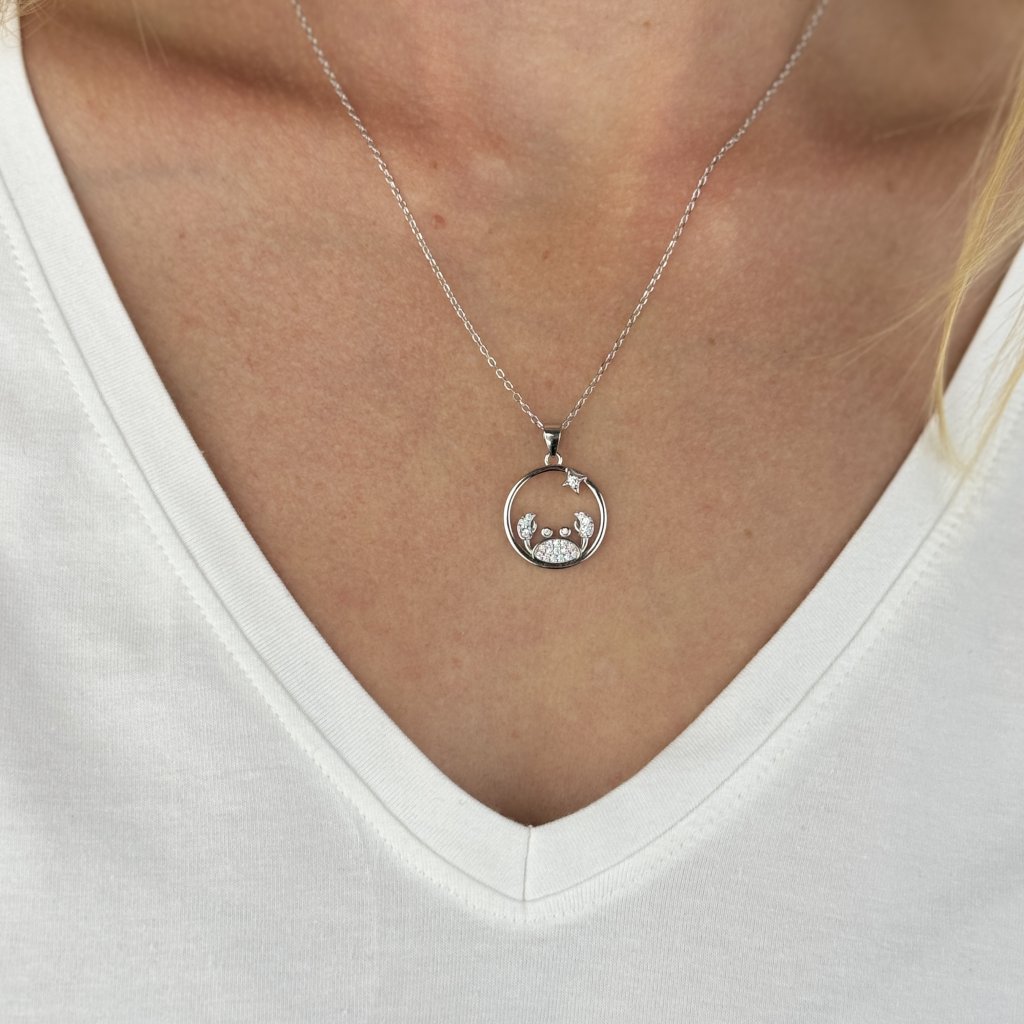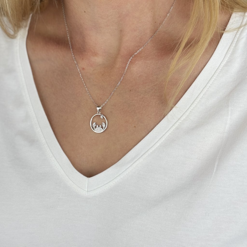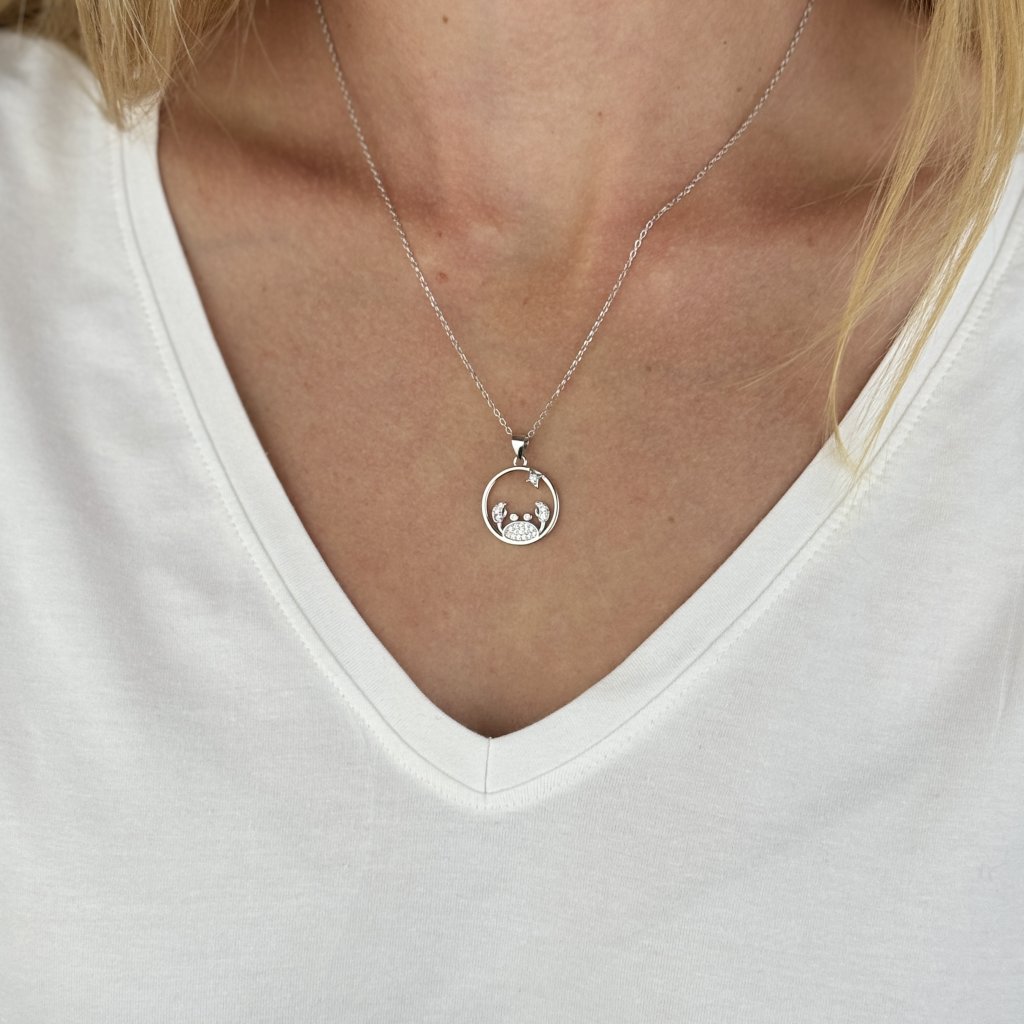 Stříbrný přívěsek RAK s řetízkem je půvabným a významuplným šperkem pro ty, kteří se narodili mezi 21. červnem a 22. červencem, nebo pro každého, kdo obdivuje vlastnosti tohoto znamení. Vyroben z kvalitního stříbra 925 s rhodiovanou povrchovou úpravou, přívěsek o průměru 17 mm je zdoben třpytivými zirkony, které zvýrazňují symbol Raka.