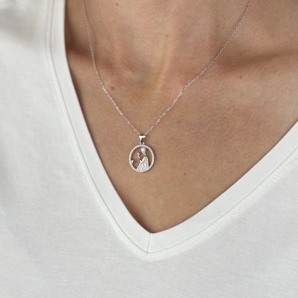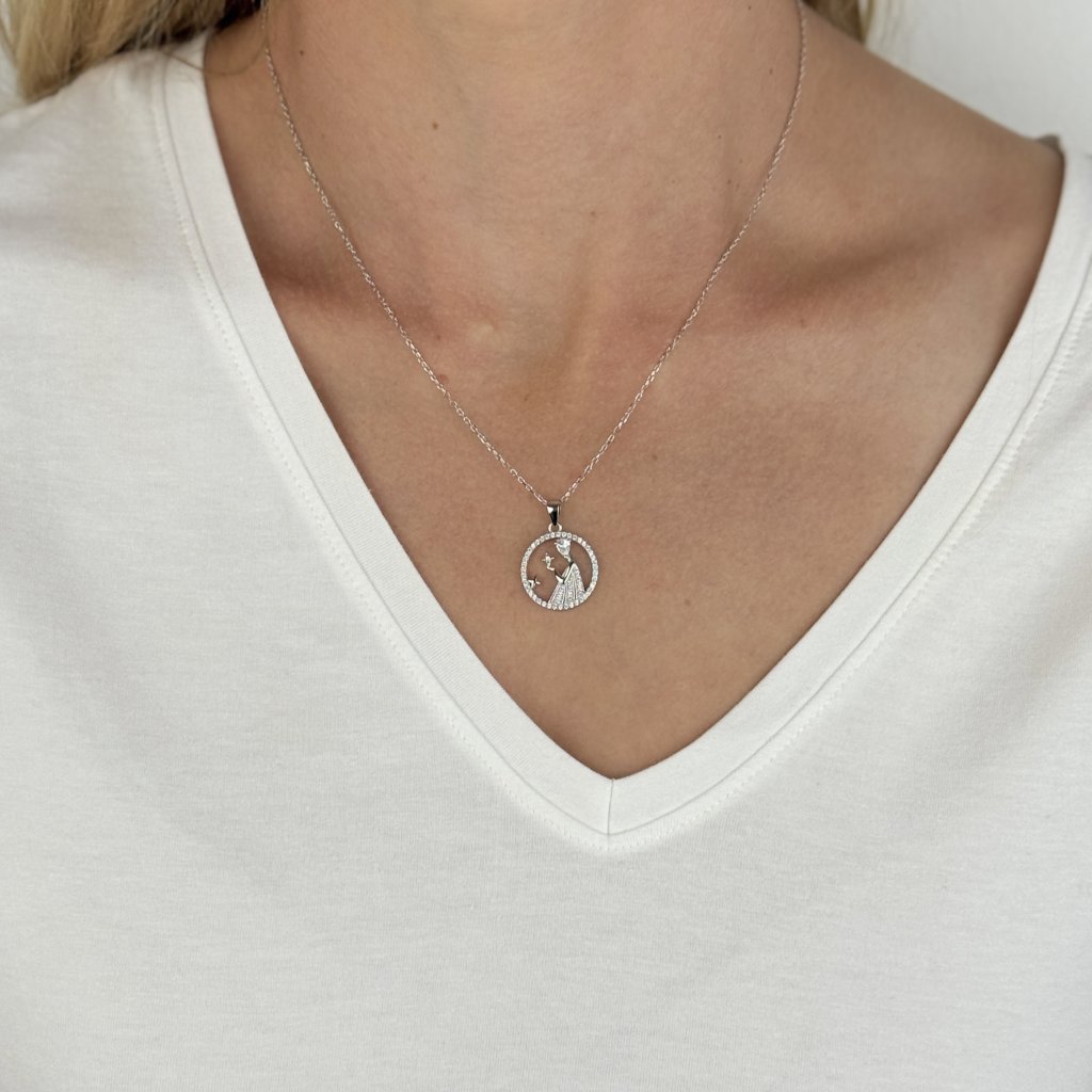 Stříbrný přívěsek PANNA s řetízkem je elegantním a významuplným šperkem pro ty, kteří se narodili mezi 23. srpnem a 22. zářím, nebo pro každého, kdo obdivuje vlastnosti tohoto znamení. Vyroben z kvalitního stříbra 925 s rhodiovanou povrchovou úpravou, přívěsek o průměru 17 mm je zdoben třpytivými zirkony, které zvýrazňují symbol Panny.