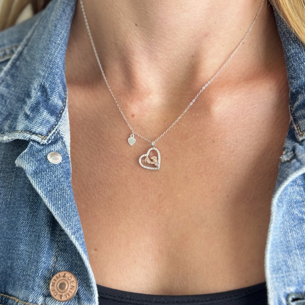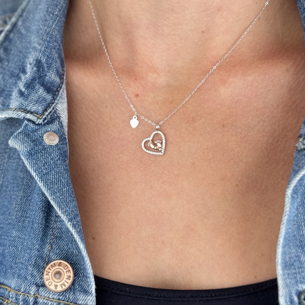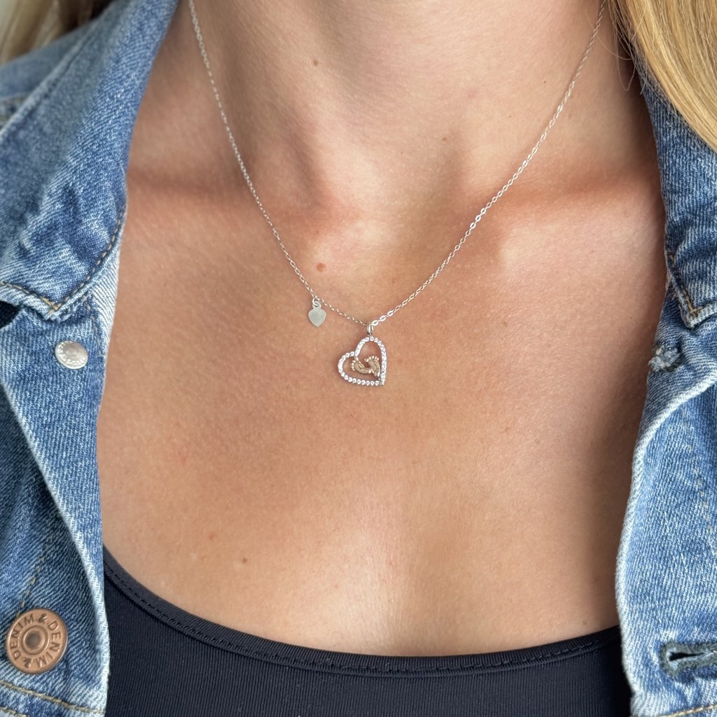 Stříbrný řetízek s přívěskem BABY FEET je dojemný a elegantní šperk, který oslavuje krásu mateřství a rodičovství. Přívěsek je vyroben z kvalitního stříbra 925/1000 s rhodiovanou povrchovou úpravou a růžově zlacenými detaily pro dlouhotrvající lesk a odolnost.