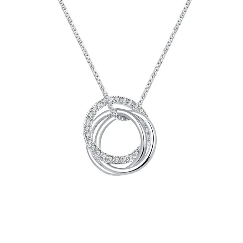Tři propletené kruhy symbolizují spojení minulosti, přítomnosti a budoucnosti. Zirkony zdobený kruh představuje přítomnost, která září nejjasněji a osvětluje naši cestu. Řetízek o délce 45 cm zajišťuje pohodlné nošení a dokonalé vyniknutí přívěsku.