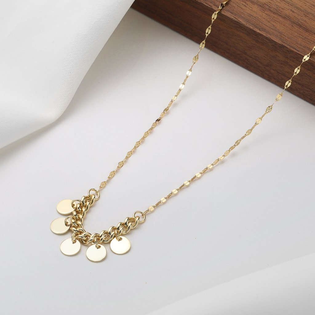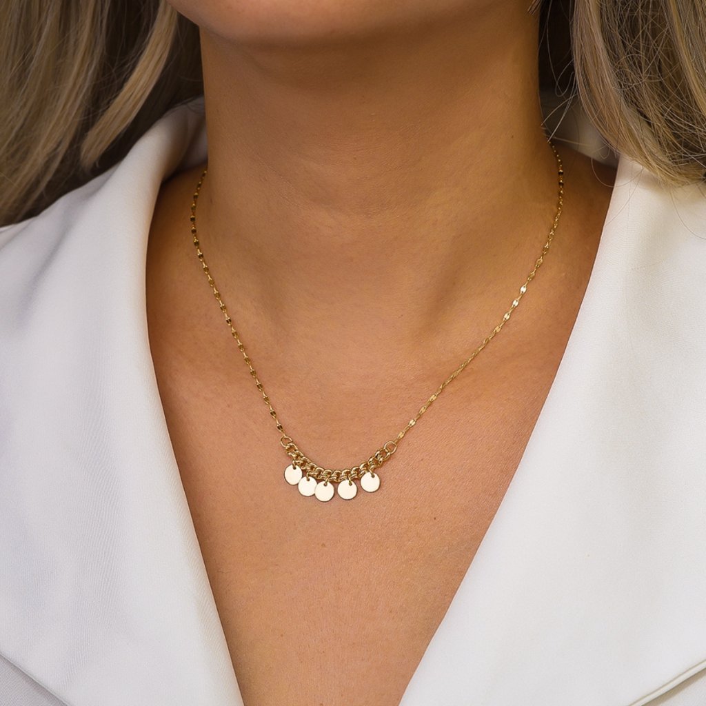 V přední části náhrdelníku se nachází pět jemně broušených medailonků o rozměru 40 × 9 mm, které tvoří dominantní detail celého šperku. Jejich hladký a čistý vzhled krásně vynikne v dekoltu a dodává šperku výraz bez zbytečného zdobení. Díky délce 40 + 5 cm se řetízek perfektně přizpůsobí a pohodlně sedí.