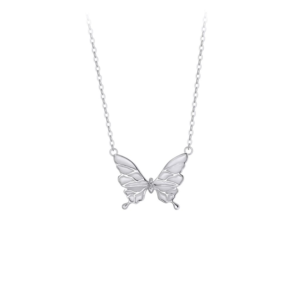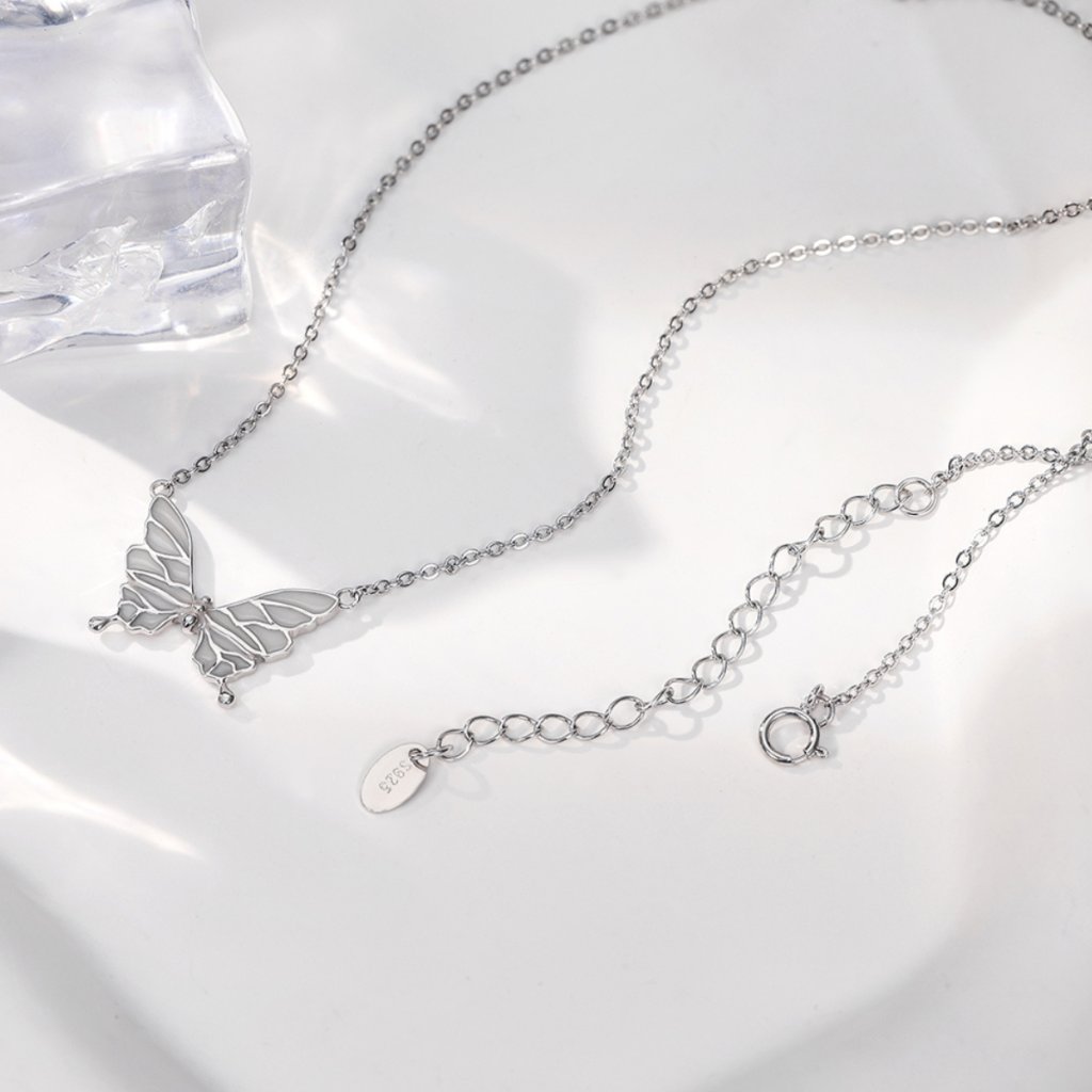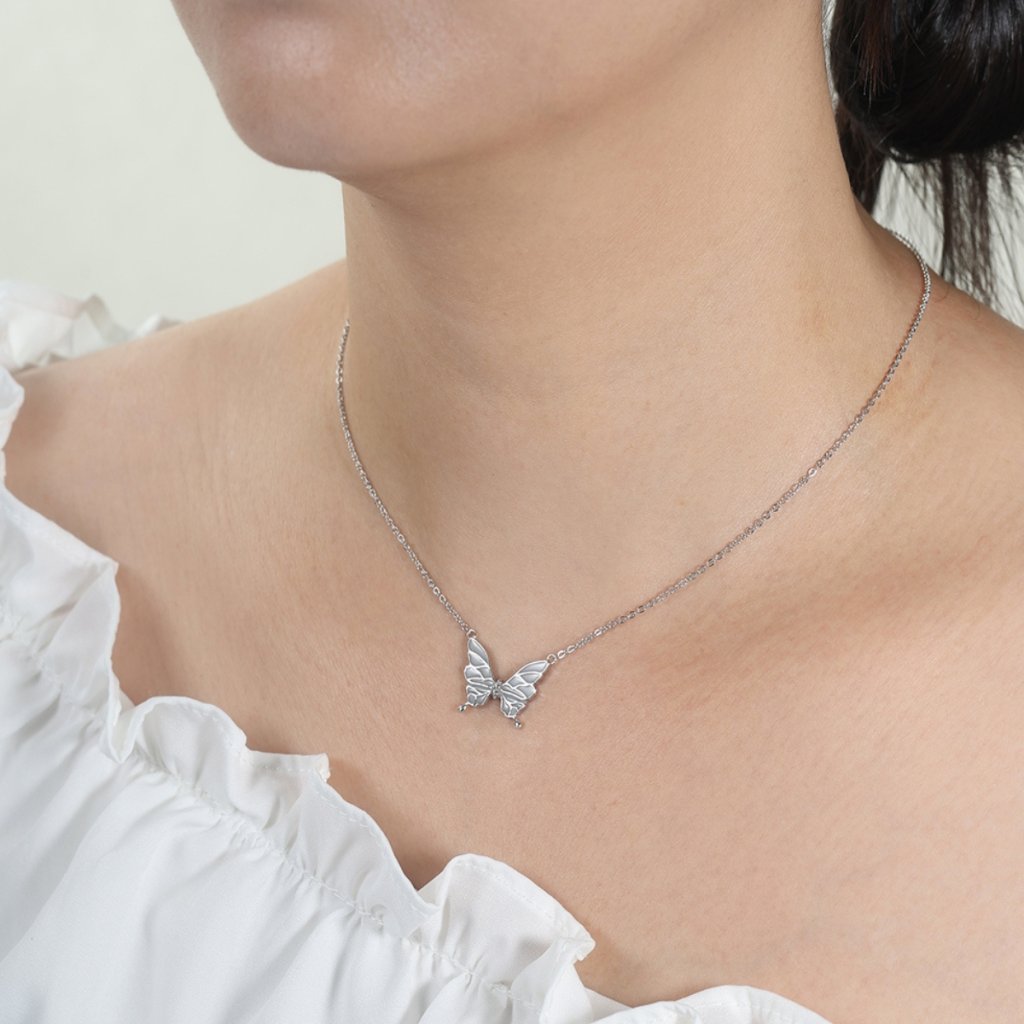 Náhrdelník je vyroben z ryzího stříbra 925/1000 s rhodiovou povrchovou úpravou, která zajišťuje dlouhotrvající lesk a ochranu před zmatněním. Přívěsek motýlka o rozměrech 18 × 13 mm je zpracován s pečlivostí o každý detail, což mu dodává na eleganci a jedinečnosti.