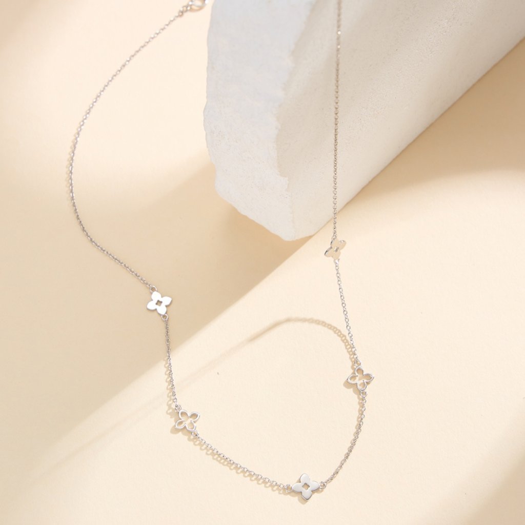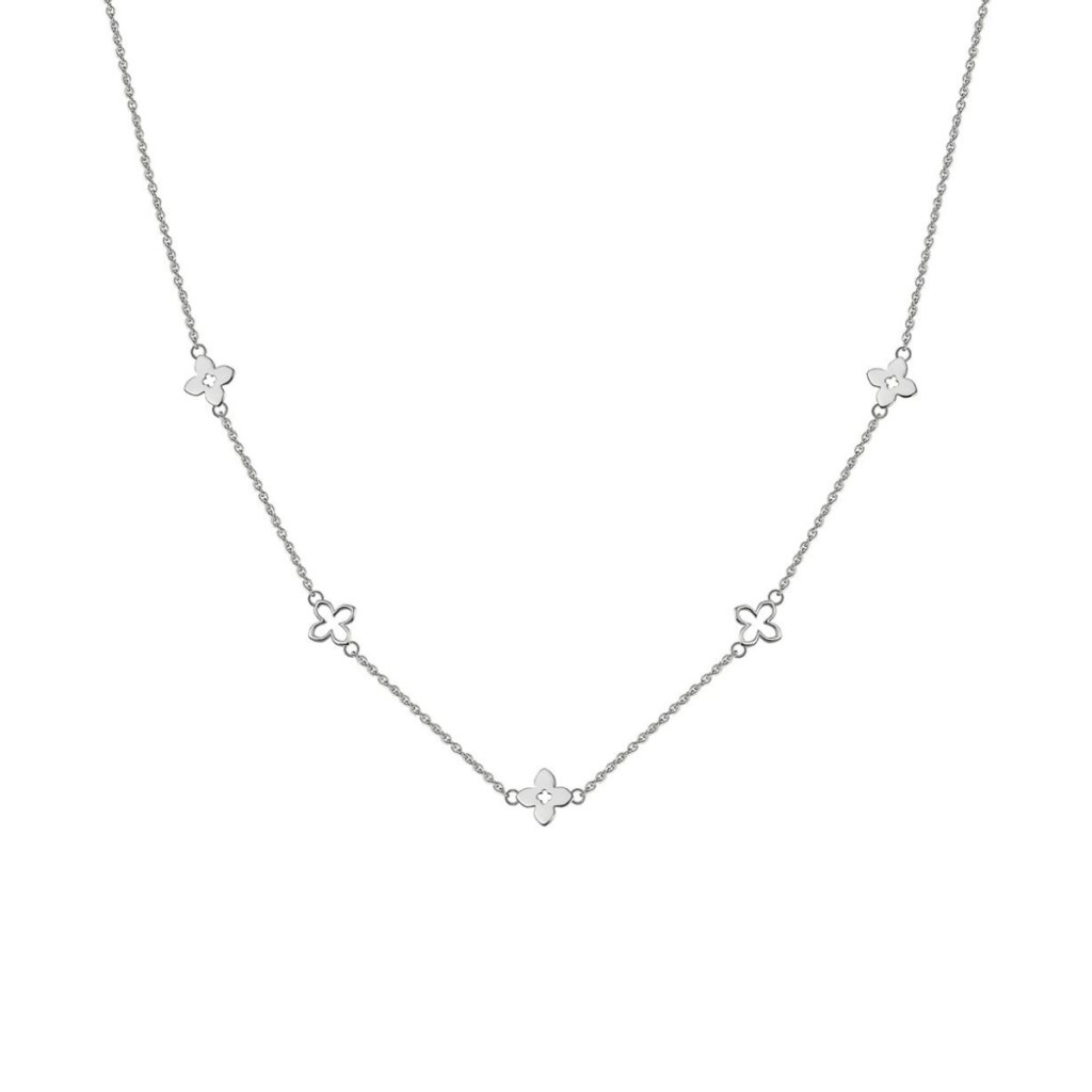 Stříbrný řetízek EVELYNE je symbolem jemné elegance a radosti. Jeho motiv květin, čtyřlístků a hvězdiček odkazuje na štěstí a pozitivní energii, kterou si tak můžete nosit vždy při sobě. Vyrobený je z kvalitního stříbra Ag925/1000, doplněného o rhodiovou povrchovou úpravu. Ta chrání šperk před zčernáním, zvyšuje jeho lesk a zajišťuje dlouhou životnost.