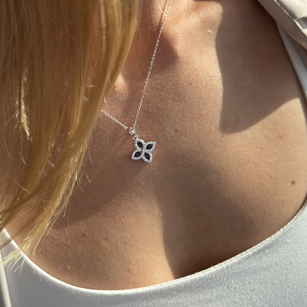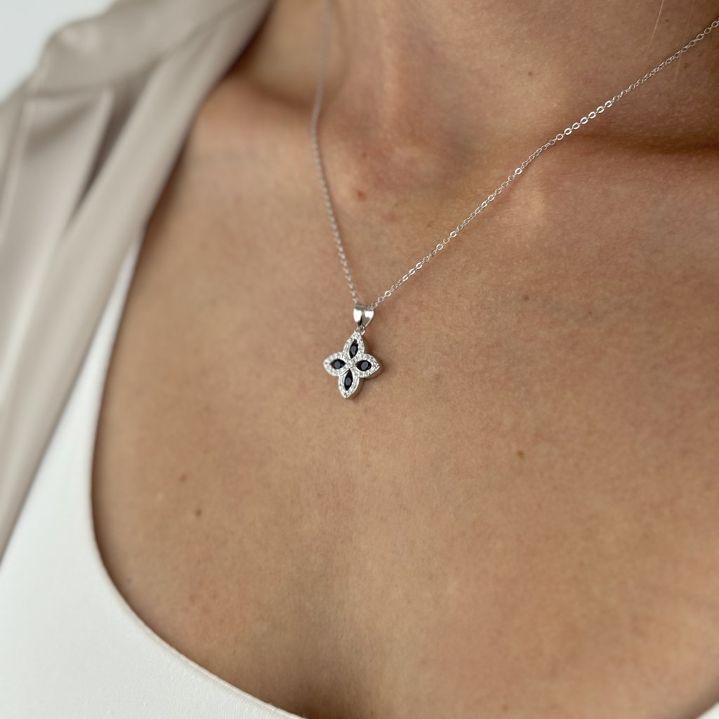Tento jemný a elegantní šperk je vyroben z kvalitního stříbra s ryzostí Ag925/1000 a je zdobený modrými a čirými zirkony, které dodávají šperku okouzlující třpyt a sofistikovanost.