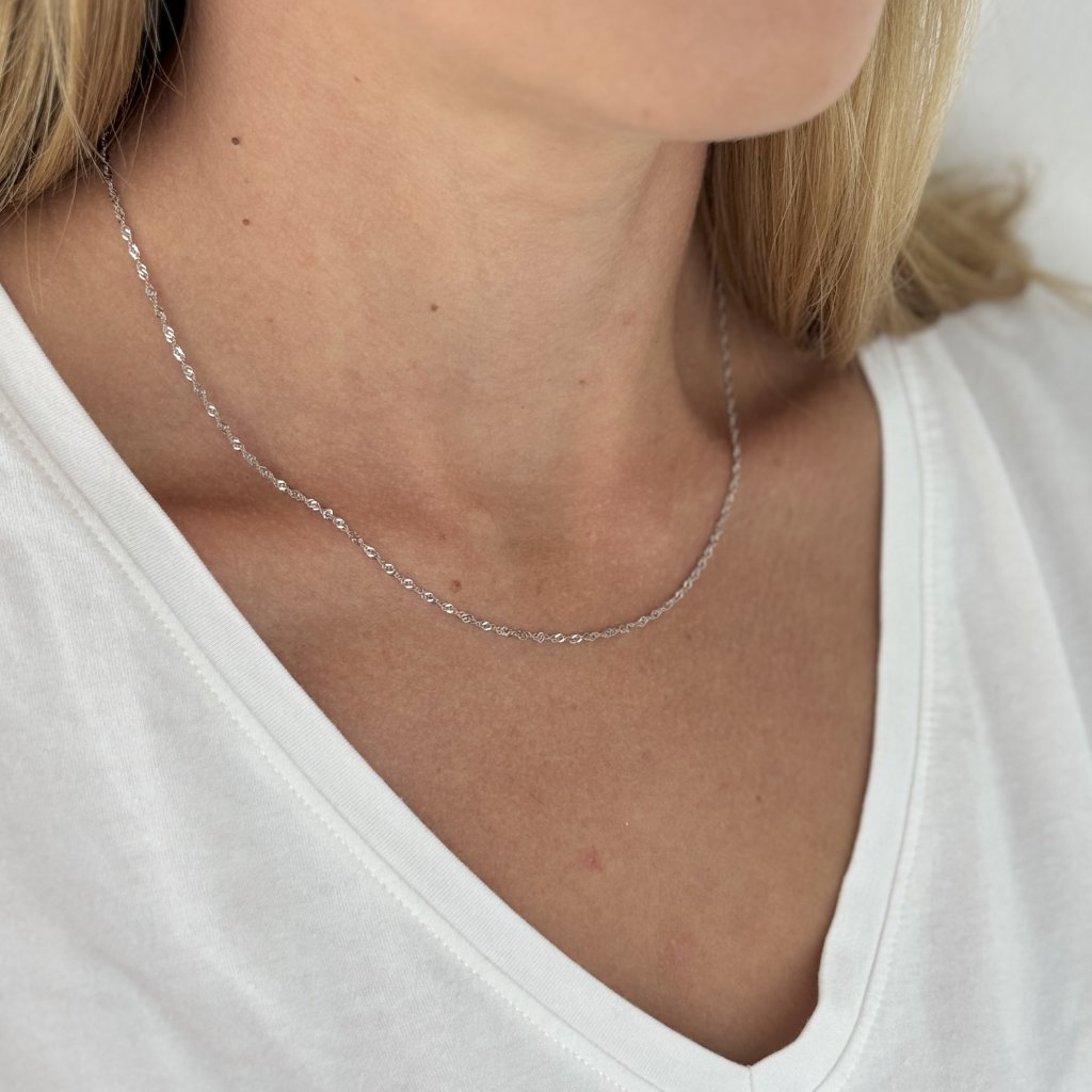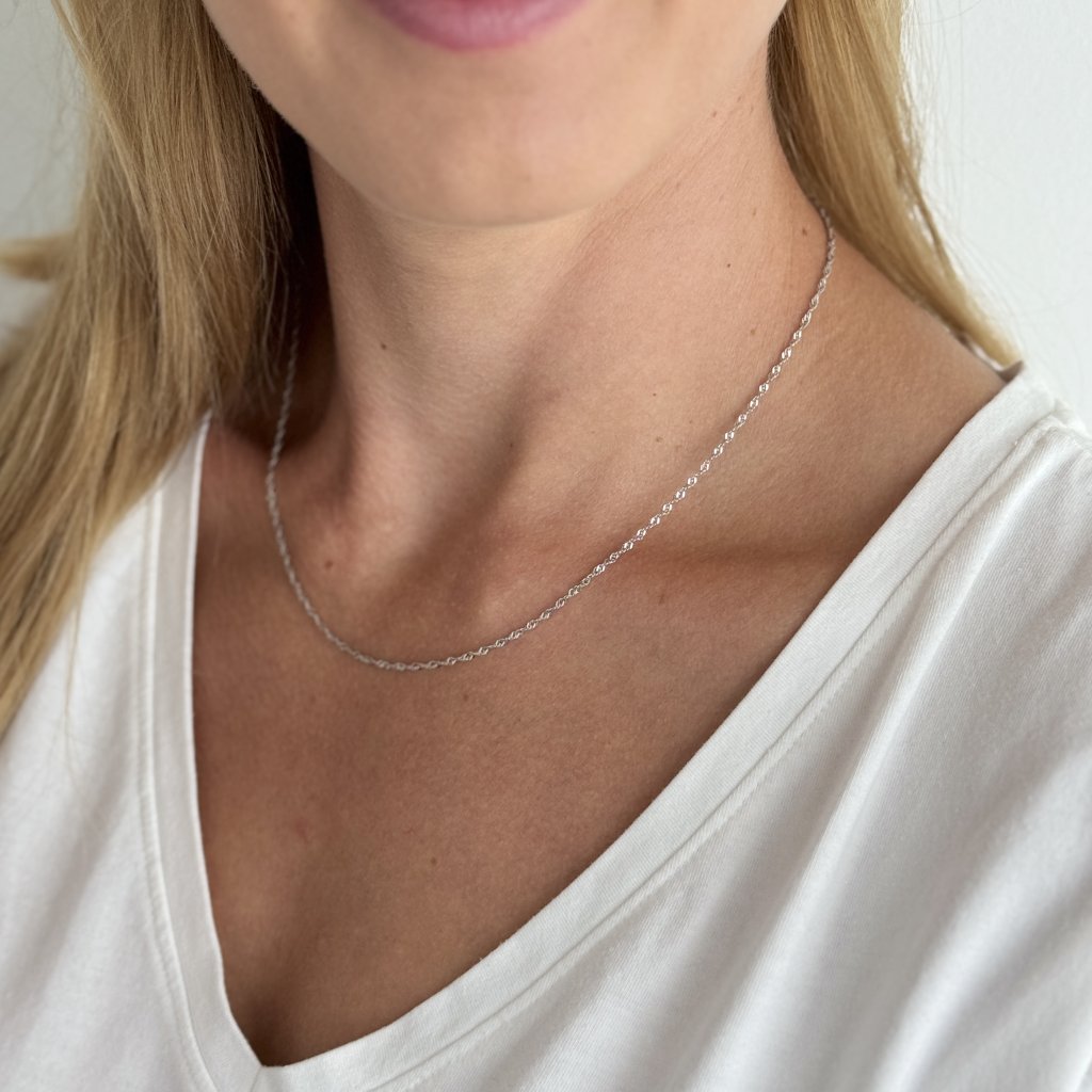 Tento šperk je vyroben z nejkvalitnějšího stříbra 925. Řetízek je rhodiován, což znamená, že je pokryt vrstvou rhodia, která dodává šperku lesk a pomáhá chránit před poškrábáním a opotřebením. S jeho délkou 44 cm a šířkou 1,45 mm je tento řetízek jemný, elegantní a přesto nápadný.