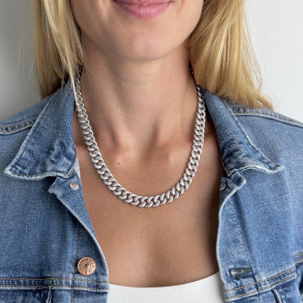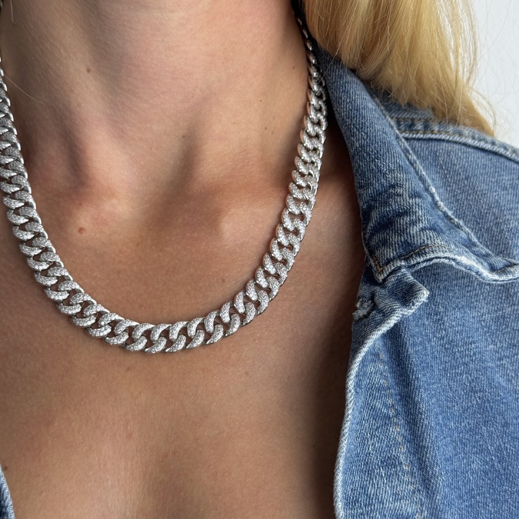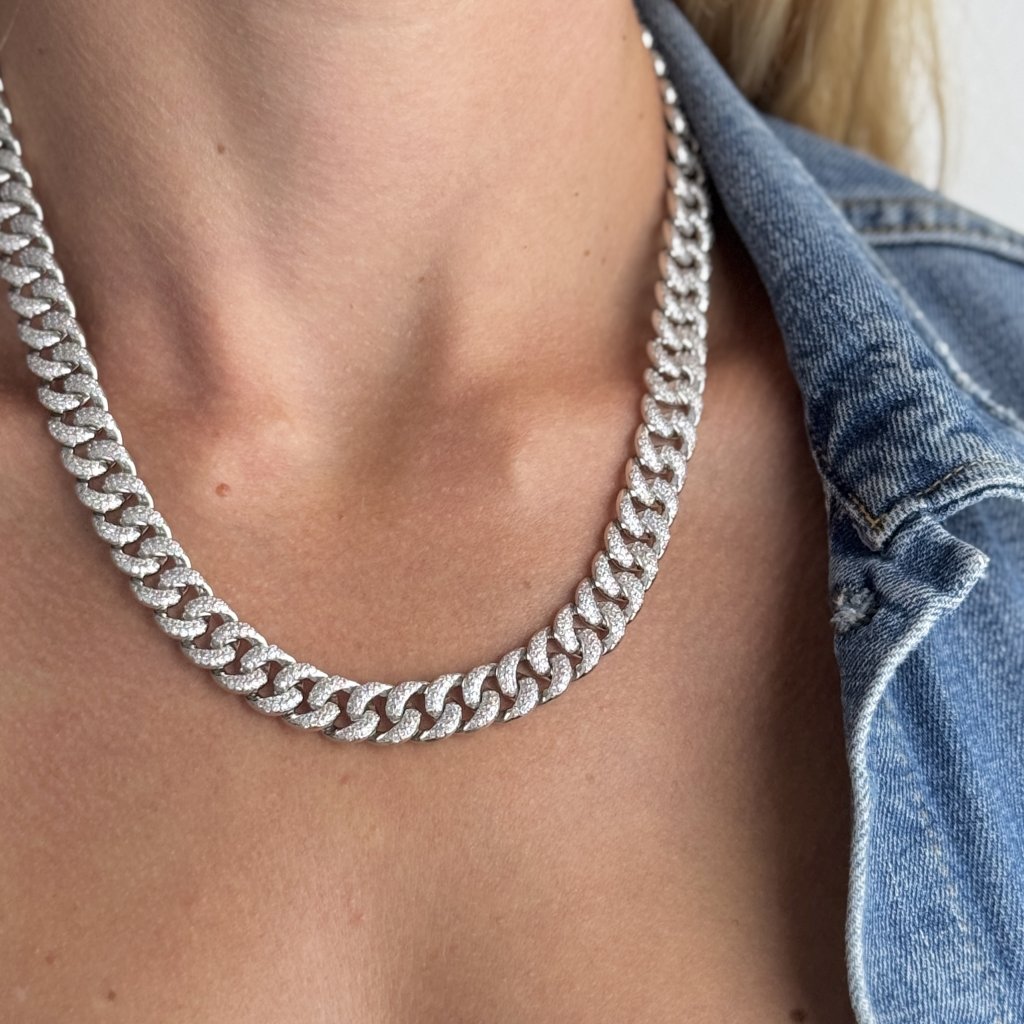Jeho celá délka 48 cm je posázena třpytivými zirkony, které mu dodávají neobyčejný lesk a eleganci. S šířkou 10 mm je tento náhrdelník nepřehlédnutelným doplňkem, který okamžitě upoutá pozornost.
