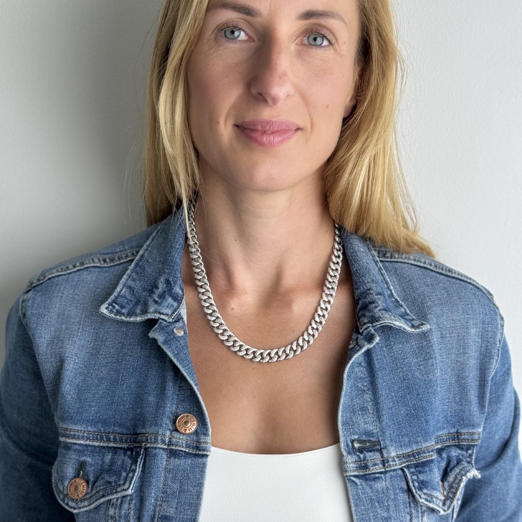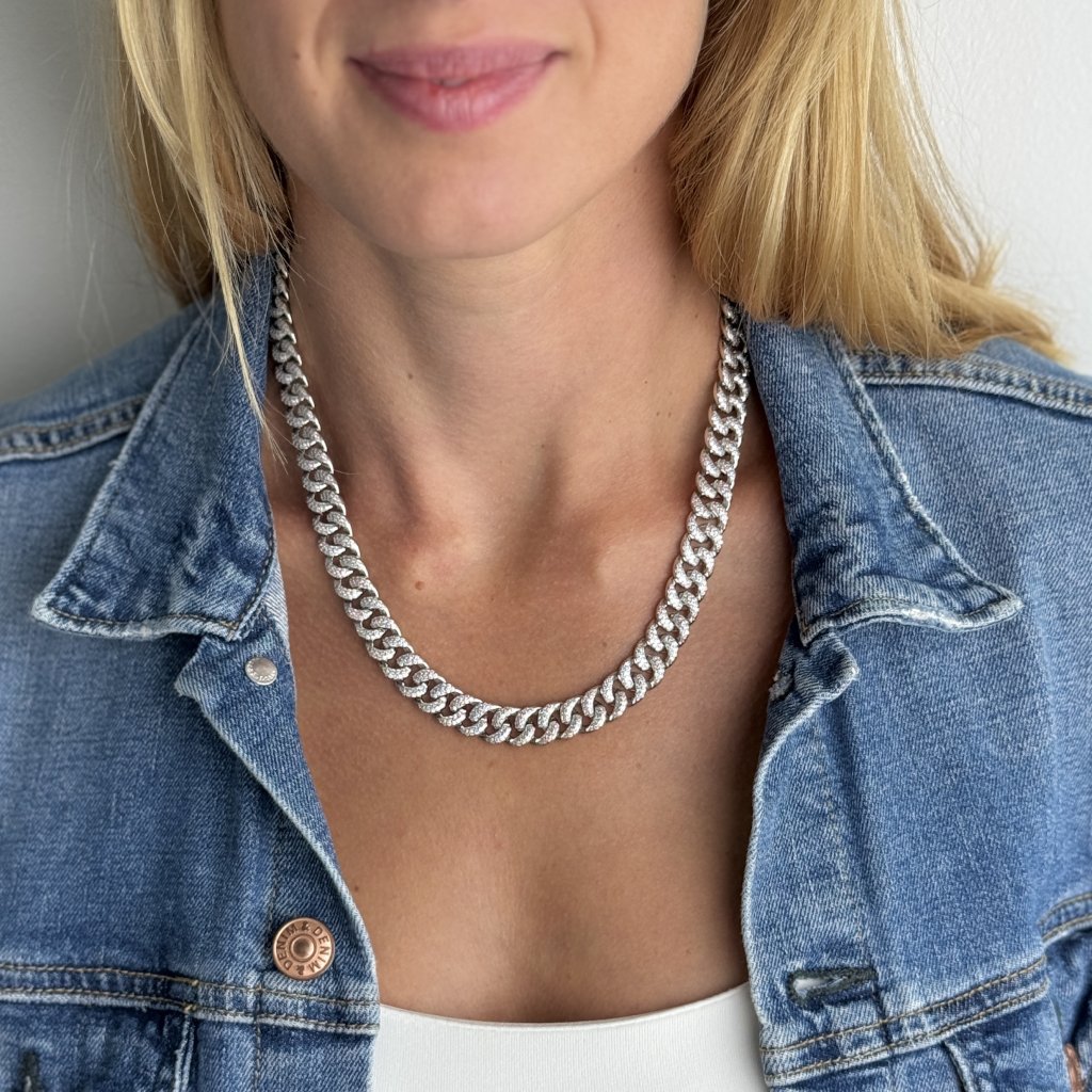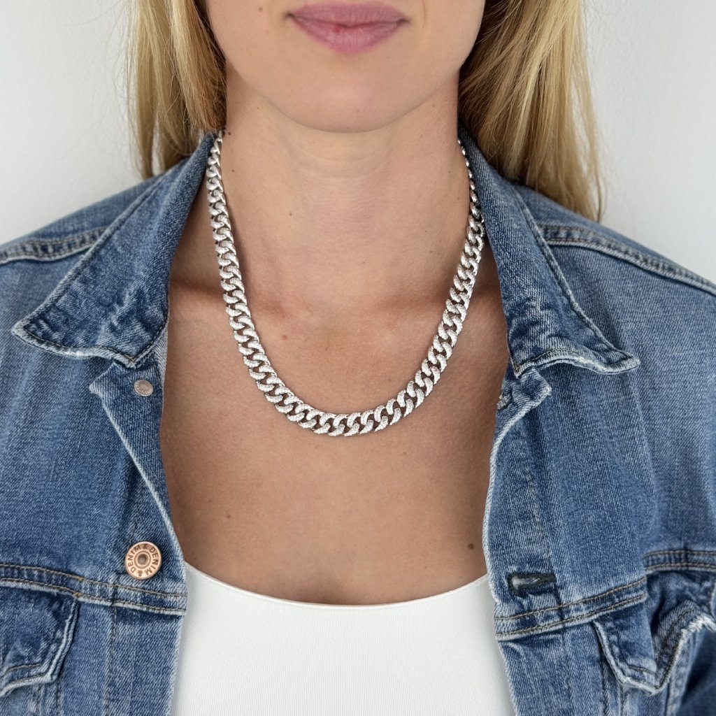 Jeho celá délka 48 cm je posázena třpytivými zirkony, které mu dodávají neobyčejný lesk a eleganci. S šířkou 10 mm je tento náhrdelník nepřehlédnutelným doplňkem, který okamžitě upoutá pozornost.