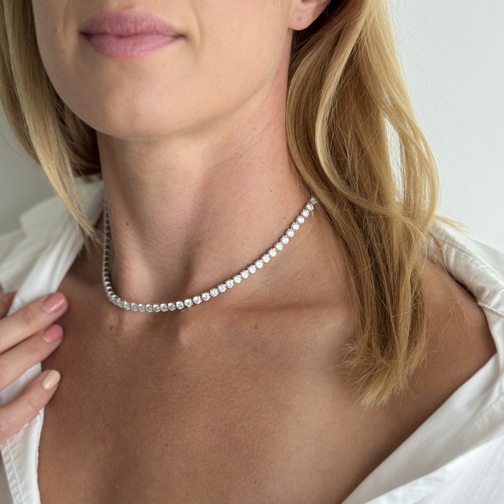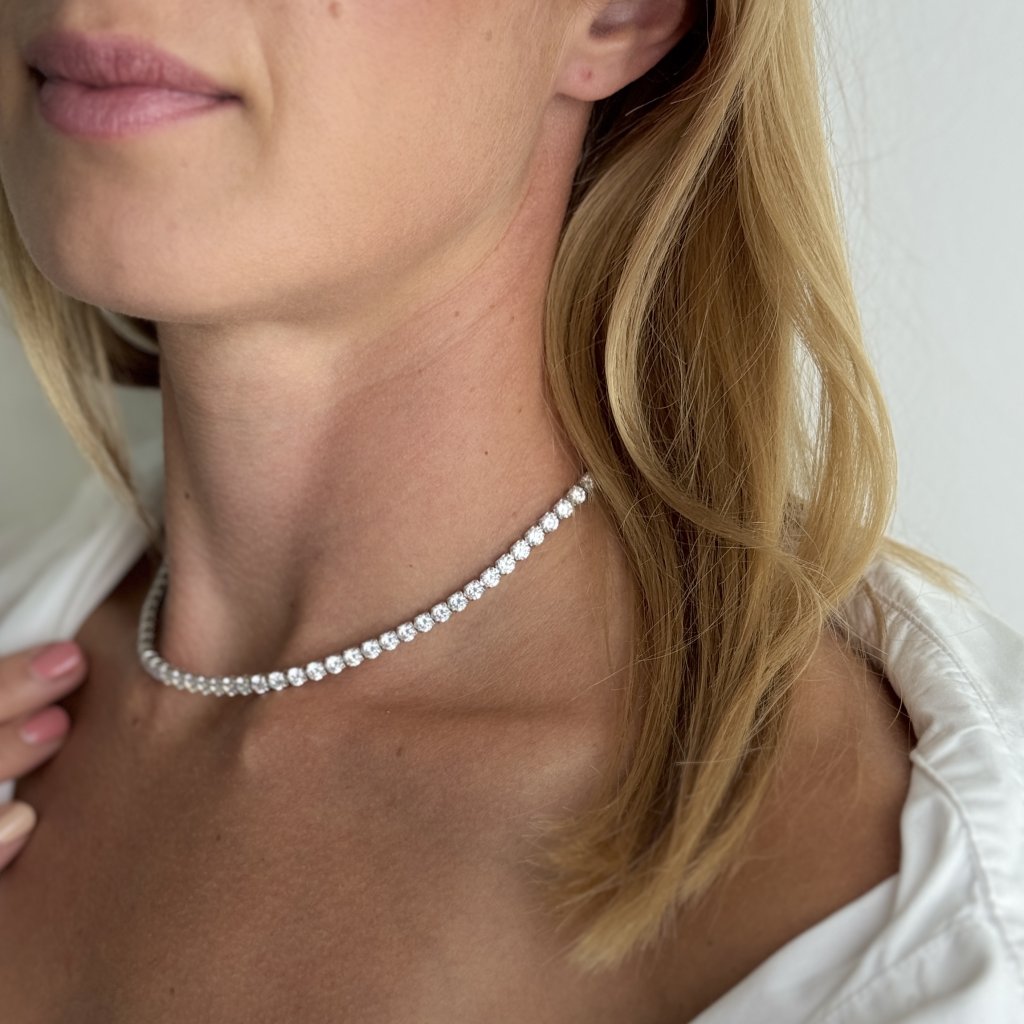 Stříbrný tenisový choker AMELIA je vrcholem současné elegance. Řada třpytivých zirkonů v impozantní šířce 4 mm vytváří ohromující světelný efekt, který nenechá nikoho chladným. Díky nastavitelné délce 36+5 cm můžete náhrdelník nosit v různých výškách kolem krku.